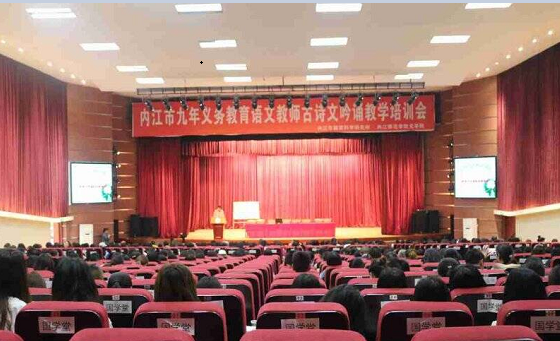 内江市九年义务教育语文教师古诗文吟诵教学培训活动于2019年4月18日至4月19日在我校东区礼堂隆重举行。本次活动由内江师范学院文学院和内江市教育科学研究所联合主办,400多名内江市中小学教师和100多名文学院师范方向学生全程参与了这次活动。文学院院长助理张文彬老师、教材教学法教研室所有教师出席活动,张文彬老师代表文学院致欢迎词。
