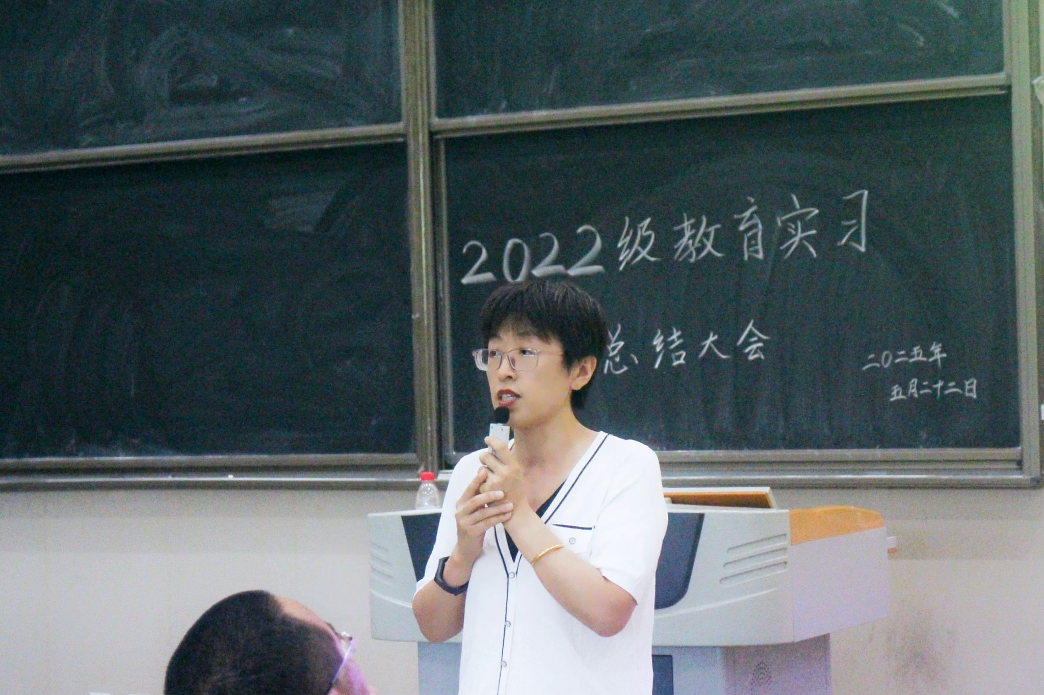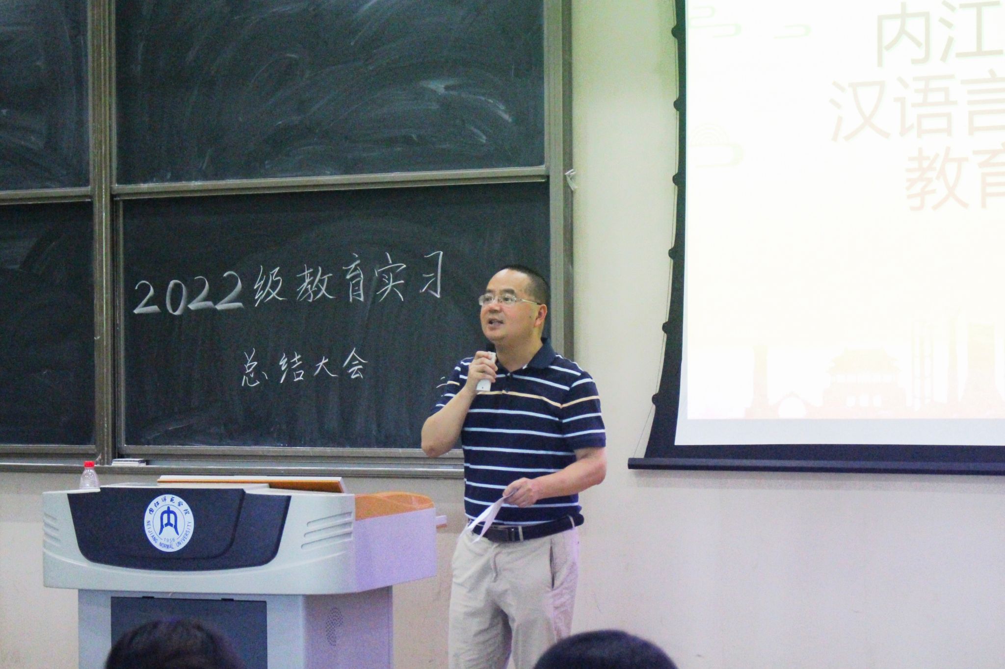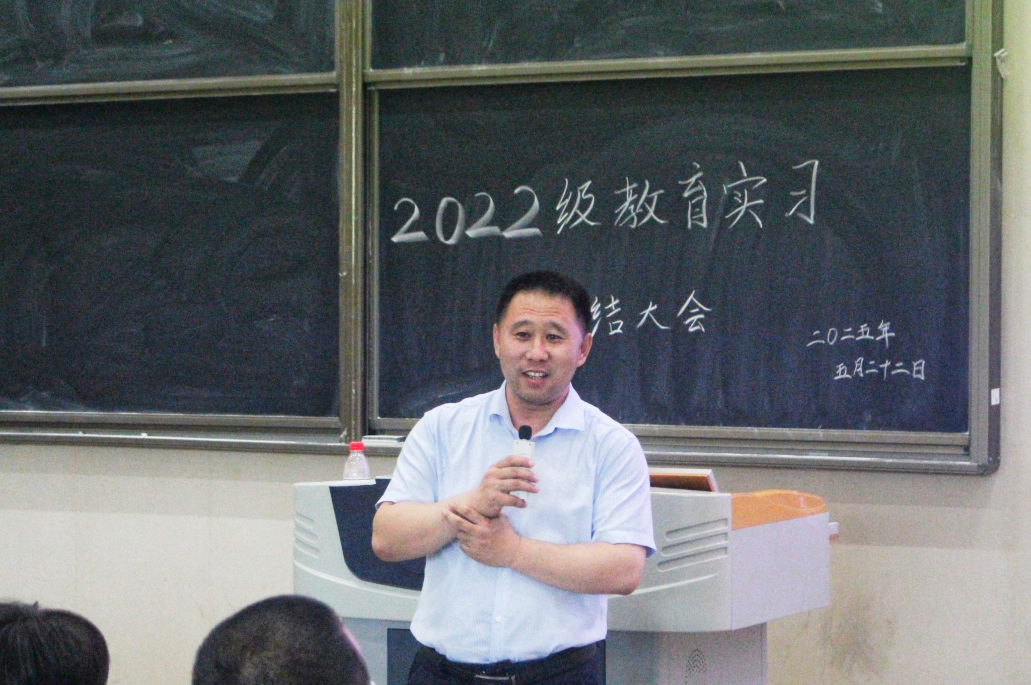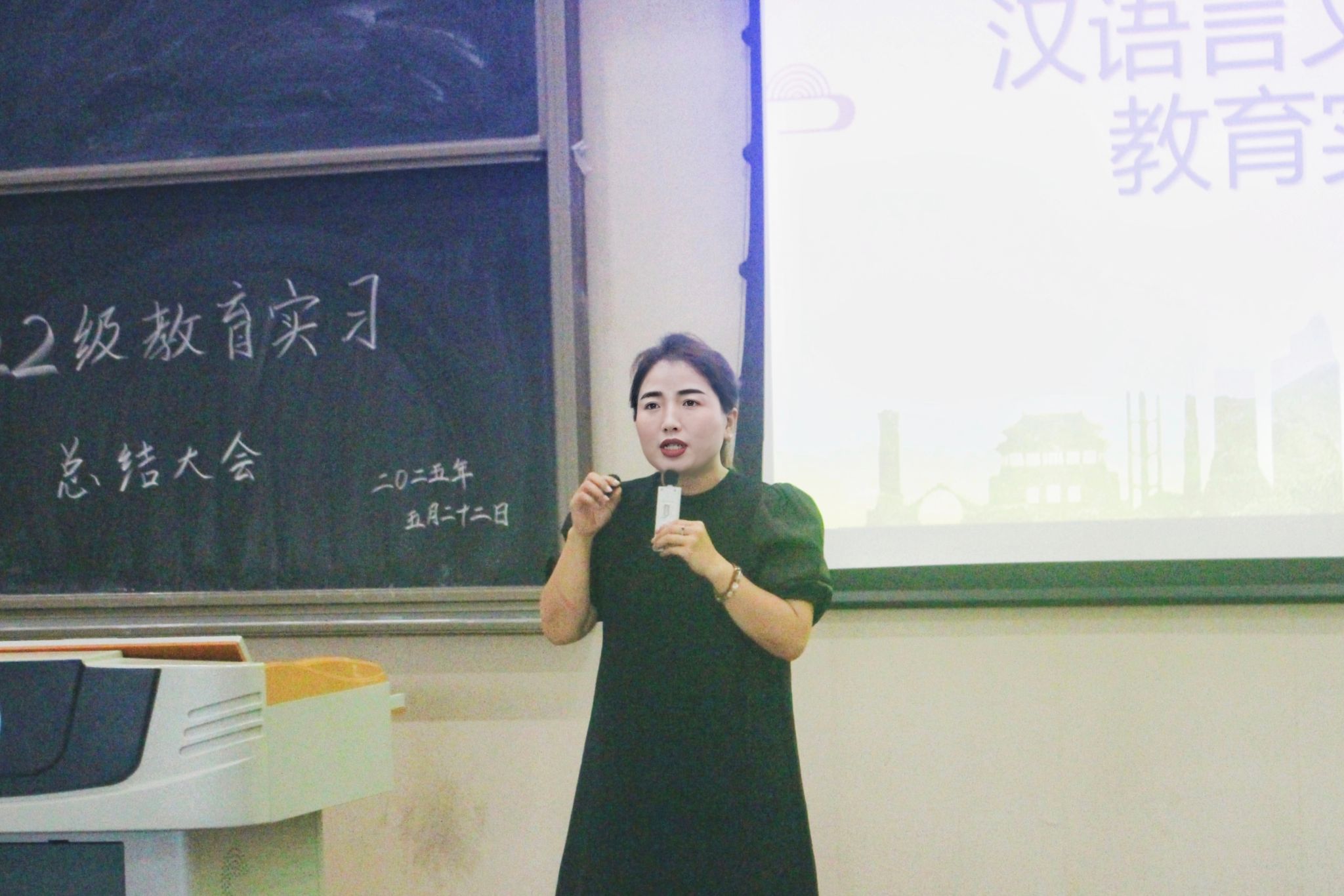 教育实习是师范生必修的教师教育实践课程,对培养学生的职业道德、教育教学能力、班主任管理能力和教学研究能力,促进学生全面发展方面具有重要作用。为梳理总结教育实习过程中的经验和不足,为下一阶段的学习就业指明方向,文学院于2025年5月22日下午3点在明德楼B区213教室举行了2022级教育实习总结大会,文学院党委书记周艺、副院长(主持工作)梁明玉、院长助理王昕、驻点老师、班主任、辅导员易晓慧、韩晓婷、胡卫、雷业、代思韫老师及2022级汉语言文学专业学生参加了大会。