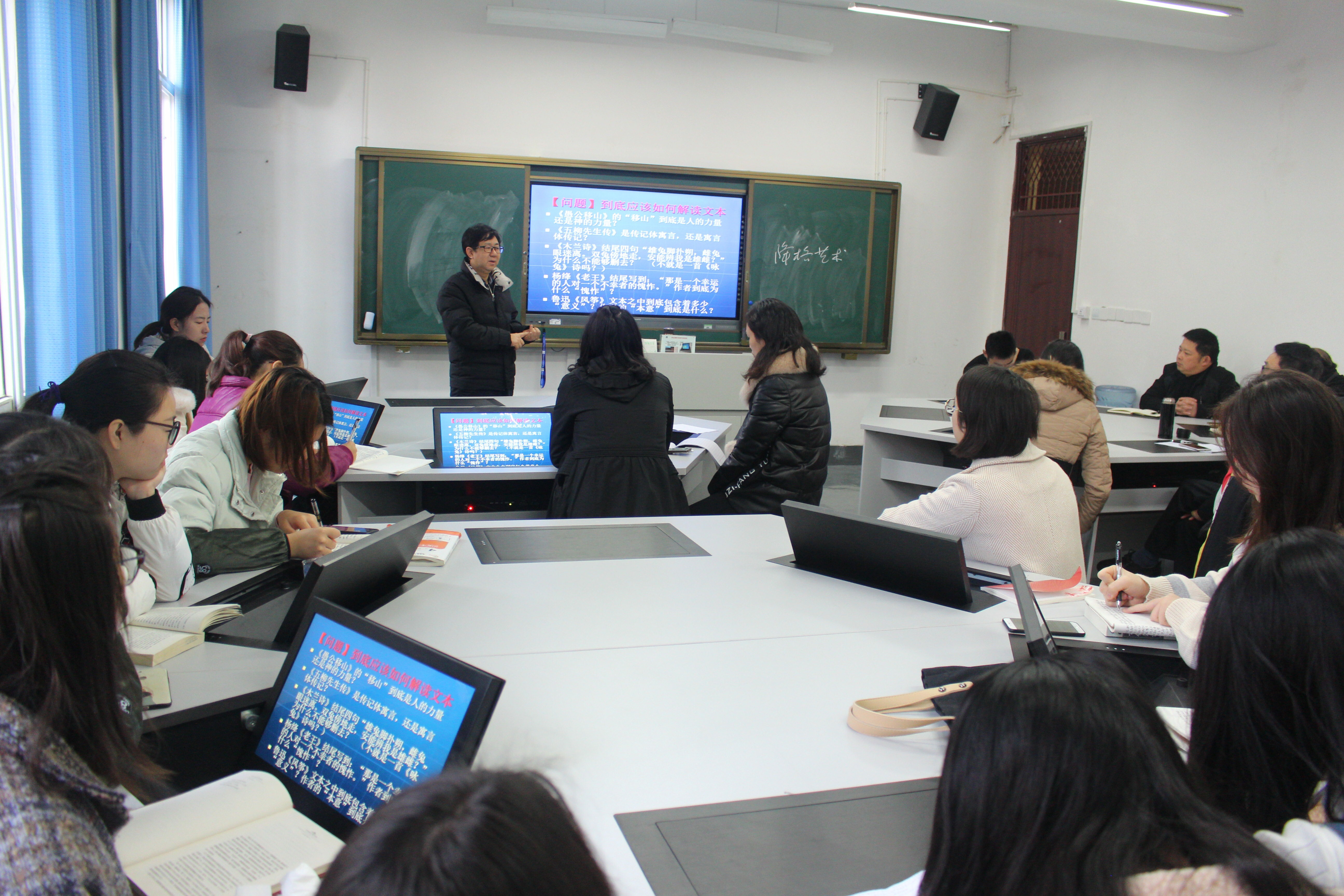 2018年11月25日上午9点,来自重庆外国语学校的特级教师李安全于我校第二教学楼202教室开展了关于“文本解读与教学设计”的专题讲座。国培计划初中语文组全体成员与部分师范系学生到场参听讲座。