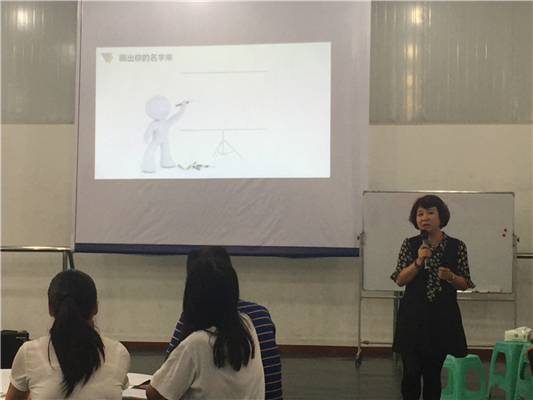 上课伊始,杜老师就让老师们在一张白纸上画出自己的名字,最后以小组为单位上台展示。来自内江威远某中学的李虹老师在讲解作品时的表现深深打动了在场的老师。她深情并茂地讲到,图片上的果树代表“李子树”,是她的姓“李”的象征,寓意着她“桃李满天下”的教育梦想;天空中的彩虹象征着希望、幸福,寓意着教育是充满希望与幸福的事业,代表她名字中的后一个字“虹”。详细生动的讲解赢得了现场的阵阵掌声,也打动了授课的杜老师。杜老师不仅夸奖这位老师的作品很棒,还肯定了这位老师具有深厚的教育情怀,是所有老师学习的榜样。