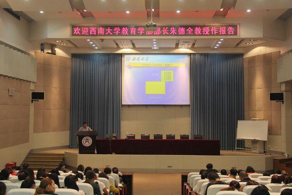 10月17日上午,西南大学教育学部部长,博士生导师朱德全教授在第一学术报告厅为“国培”小学语文班及初中语文班学员做了题为《在变革中发展:面向明日的今日教育——中国教育顶天立地之路》的报告。此次讲座由我校赵思林教授主持。