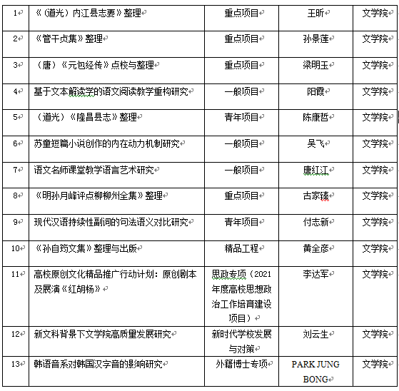 近日,我院在2020年度校级科研项目申报中取得丰硕成果,共有13项各类科研项目获立项。其中精品工程项目1项、重点项目4项,无论是申报数还是立项数均居于学校前列。