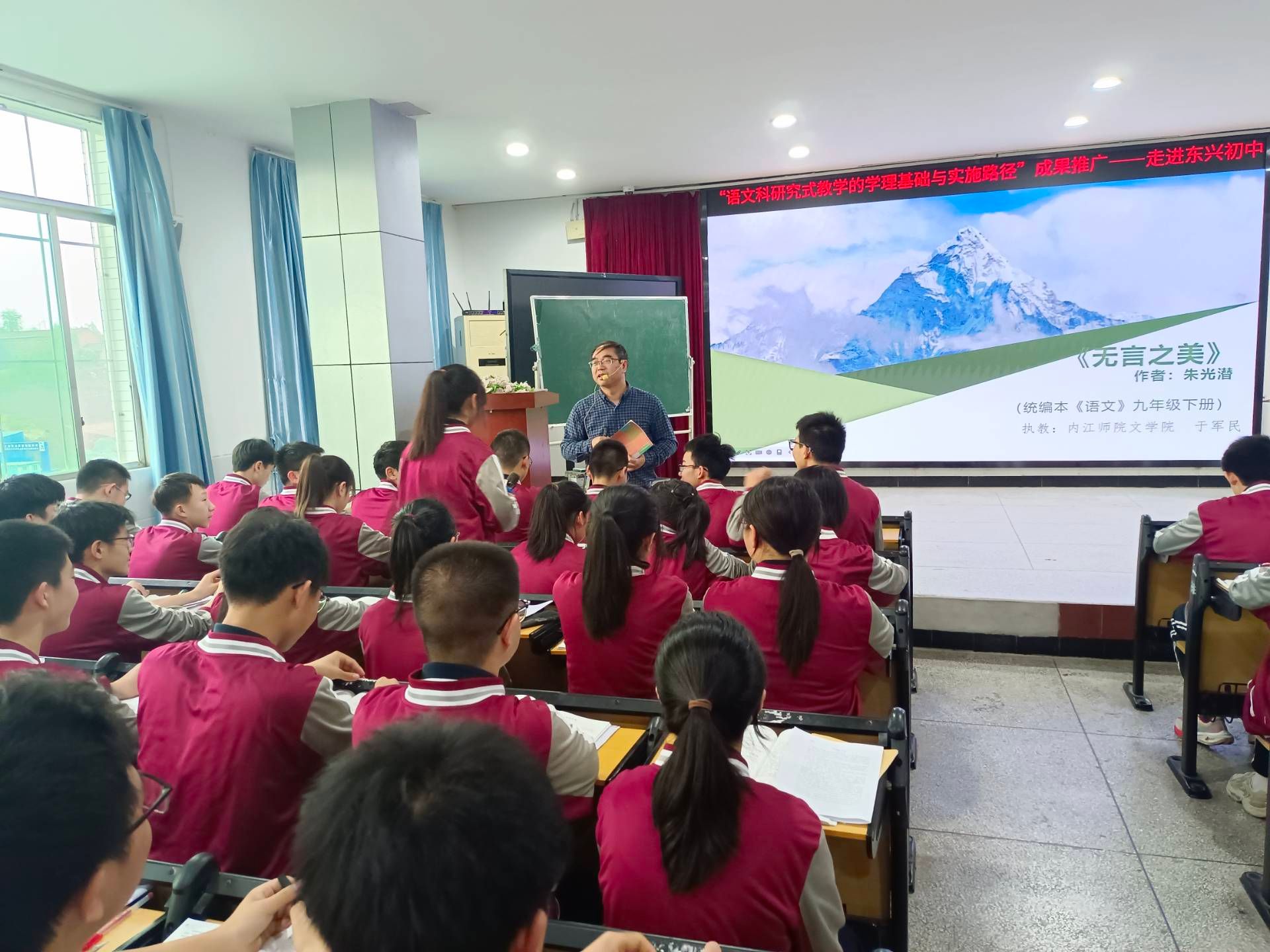 4月3日上午,四川省教育科学规划课题“语文科研究式教学的学理基础与实施路径”成果推广活动在内江市东兴初中举行。课题负责人、内江师范学院文学院于军民教授为东兴初中九年级(16)班同学执教《无言之美》。课题组全体成员、内江师范学院文学院教学法教研室全体教师、东兴区石磊名师工作室和门翠名师工作室全体成员共20余位行业骨干参加本次教研活动。