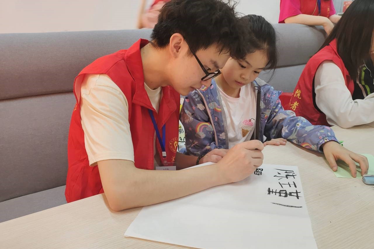 活动伊始,我院志愿者带领长安社区的小朋友们在活动区域落座,并教小朋友们做作业、折纸。在欢声笑语中,志愿者与小朋友们打成一片。随后,主持人刘星雨用爱国诗人竞答、爱国诗词问答等互动游戏引出本次活动的主题,小朋友们积极参与,竞相举手回答,气氛活跃热闹。然后,我院翰墨坊成员介绍了软笔书法、示范毛笔用法。接着,小朋友们在志愿者的指导下学习如何正确使用毛笔,并尝试用毛笔写字。新鲜的书法体验激发了小朋友们对中华优秀传统文化的热爱,使小朋友们专心投入其中。最后,本次活动在小朋友们的折纸作品、书法作品的展示中落下帷幕。