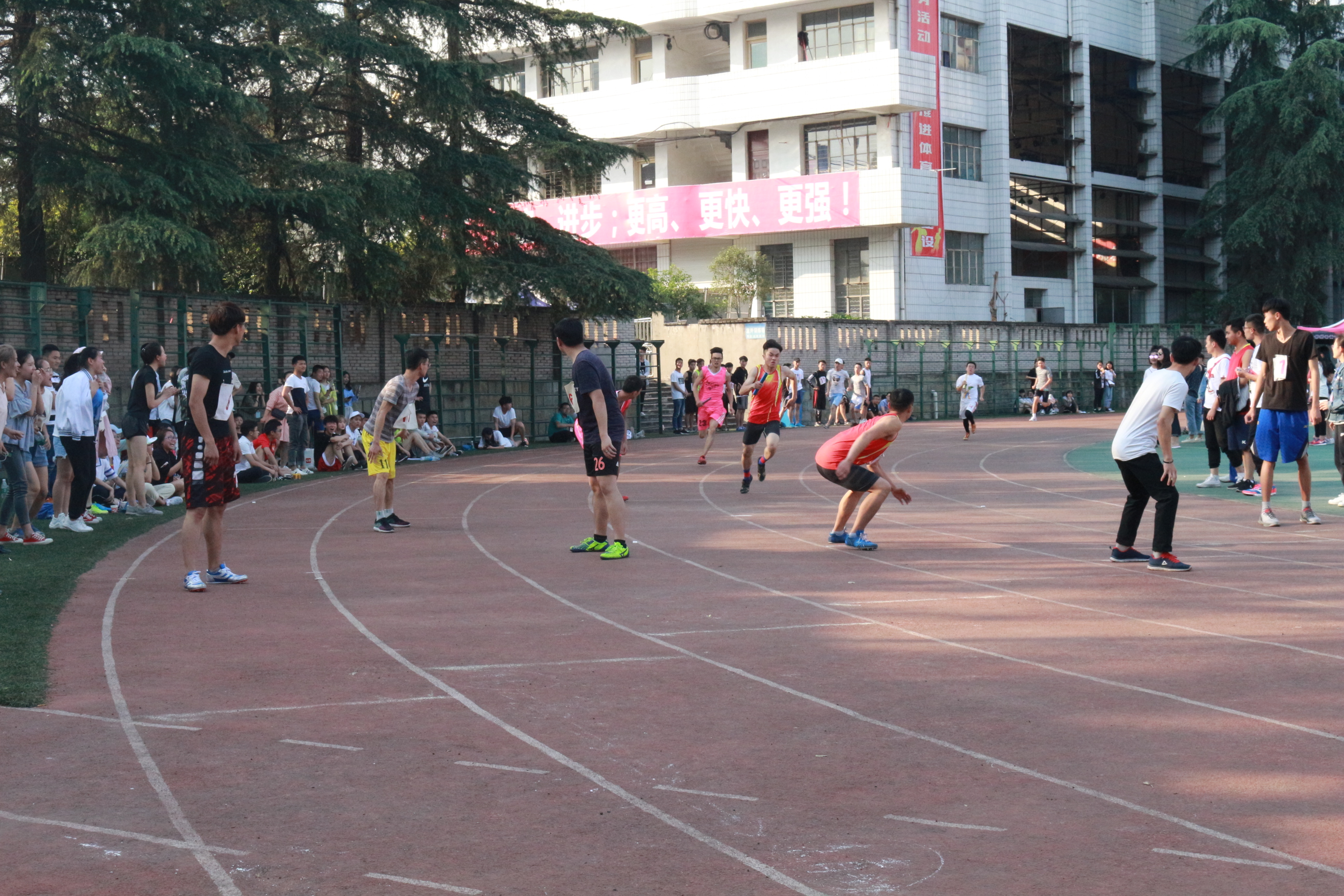 4月18日下午17点30分,我校乙组4×100米接力赛在田径场准时开始。赛前运动员在起跑点进行热身运动,希望把更好的一面展示在运动场上。