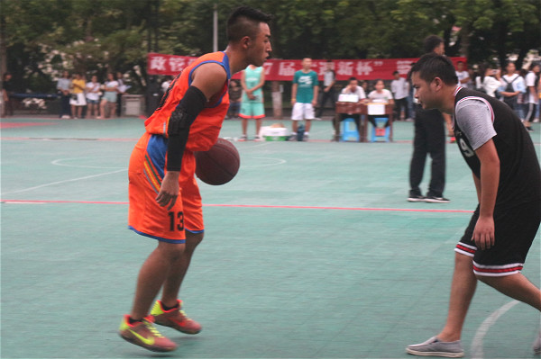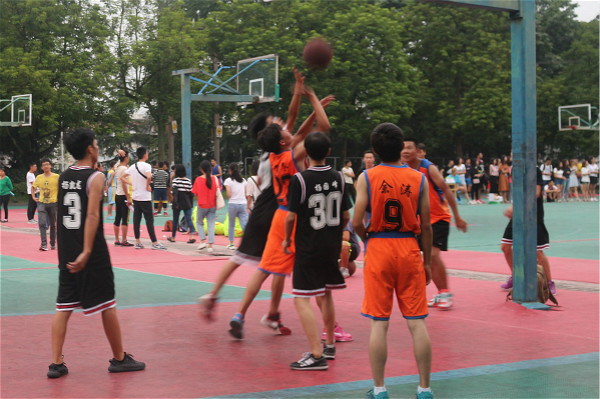 9月18日18点10分,在夕阳的映照中,内江师范学院山顶球场3号场地热闹非凡,文学院迎新杯篮球赛16级对阵17级的比赛正在火热进行中。
