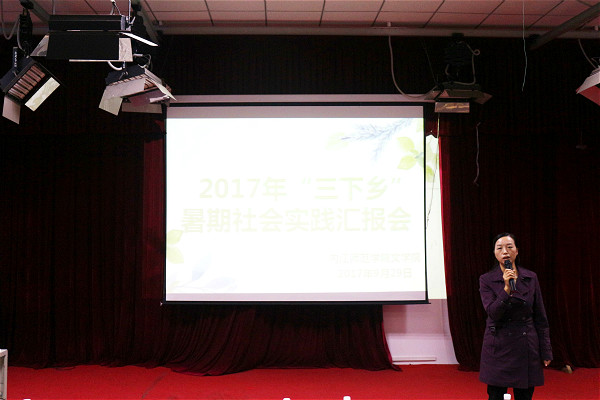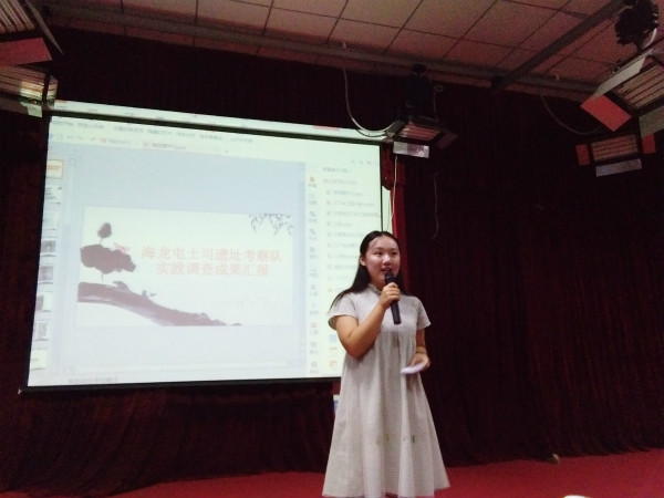 汇报会伊始,蜀道羌容实践调查队同学进行了精彩的朗诵表演,他们从羌山风貌、羌族“羊”图腾、羌碉、释比文化等不同方面展示了他们8天社会实践活动的所见所闻,用视频短片感染了会场的每一位师生。海龙屯土司遗址专题考察队分享了他们探索到的独特文化。其负责人除介绍了当地奇特的军事建筑及装饰、民间宗教文化、雕刻艺术外,还讲述了队员们为时7天的自力更生艰苦奋斗生活。“光影行记”实践队的负责人汇报了她们和内江市第二人民医院康复医院合作利用为老人摄影留下时光印记的暑期敬老活动。她们还陪老人闲聊、赠绿萝,在炎炎夏日给医院送上了一片绿意,弘扬了中华民族优秀的孝道精神。全场师生跟随着文君寻访队的代表领略了邛崃的美景,体验了文君故里的人土风情,也深刻感受了文君故里的文化底蕴。“美在内心”凉山义务支教服务队讲述了他们在谷曲乡支教的社会实践故事。他们不仅对当地的儿童青年进行了家访关爱,送去一份份小礼品,而且进行了问卷调查、防艾宣传等活动。寻访空巢老人义务敬老实践队到夕阳之家托老院看望空巢老人活动、在市区做空巢老人调查研究。他们在给内江空巢老人送去温暖关怀的同时也总结出了空巢老人产生的几大主要原因。鲁地石刻文化考察队的负责人对泰山摩崖石与泰安岱庙、曲阜三孔等地文化进行了照片显示,并总结出了鲁地石刻的几大特点,让全场师生见证了岁月的变迁和文字的魅力。“走进苗乡,体味苗韵”队伍分享了他们的实践活动和成果。全场师生一起感受了独特的苗语、苗歌,欣赏了蜡染和苗服,体会了不一样的苗族文化。