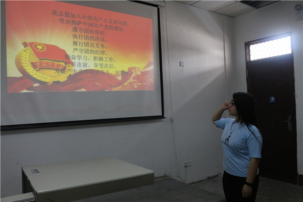组织部王钰萍同学带领全体团员们进行团员宣誓。宣誓完毕,组织部部长阮伟作活动总结,他提出作为一名共青团员应该在日常工作学习中创先争优、在急难险重任务中勇于担当。要有学习先进、争当先进的意识,发挥团员先锋岗、团员示范岗等的引领作用。