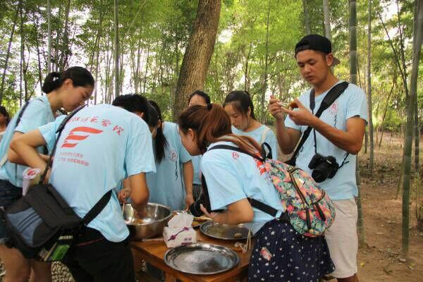 “斗牛不是真的拿牛来斗,斗是方言土话凑的意思。斗牛就是每家每户拿出一点东西拼凑在一起,并分门别类的进行比拼,优胜者表示人缘关系好”女书园里的导游向游客介绍到。据了解,斗牛节起源于“牛魔王”的生日,在这一天,要用牛休息,还要用乌饭粑粑犒赏牛。瑶族未出嫁的姑娘和出嫁不久的年轻姐妹在农历4月初8这天聚在一起集体用餐,欢乐整天。我们的队员也有幸参与了斗牛节,和面、制作粑粑、生火、油炸忙的不亦乐乎。这一天,同时是姐妹们学习女书的好日子,她们会在这一天读女书、唱女歌、互赠书写或织绣有女字的纸扇、花带、头巾等。斗牛节唱女歌、刺绣必不可少。“你要把这个绷紧,不然很难绣。”当游客刺绣被缠住时,女书传承人蒲丽娟细心的向游客介绍到。