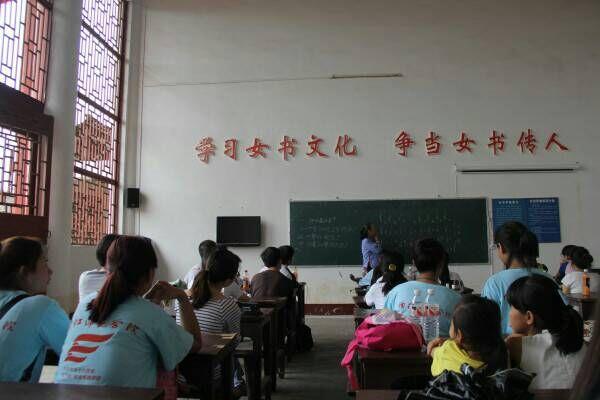 女书的传承与发展,与斗牛节有着密不可分的关系。斗牛节后,队员们再次踏进女书园,从新的角度看待女书。队员们趁着女书传承人蒲丽君向游客教导女书的机会,也细致的学习了女书的书写方式,拿笔、沾墨、提笔、下笔,白纸黑墨一个女字轻轻跃然纸上,经过一下午的学习,队员们便能熟练的写出“女”字。