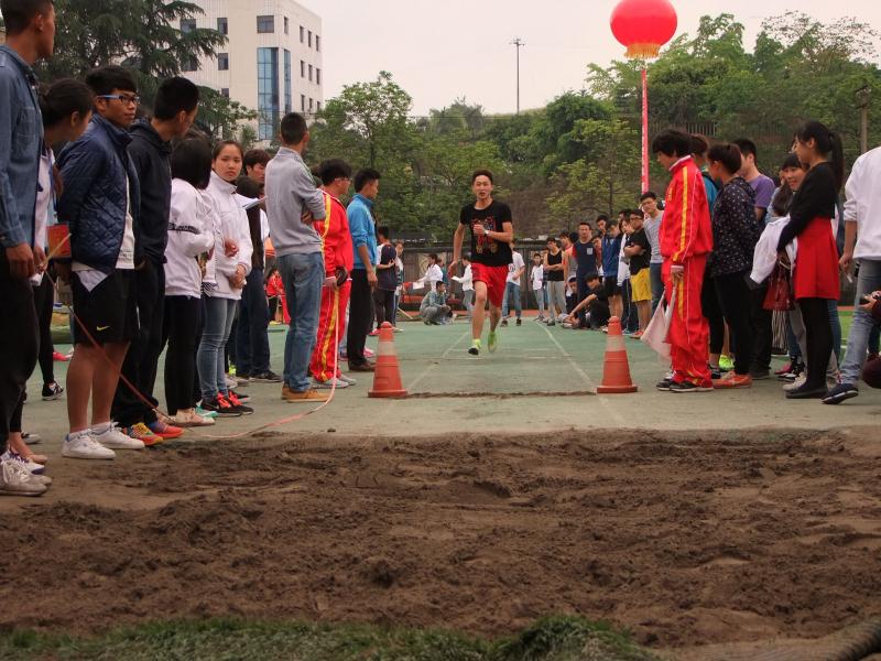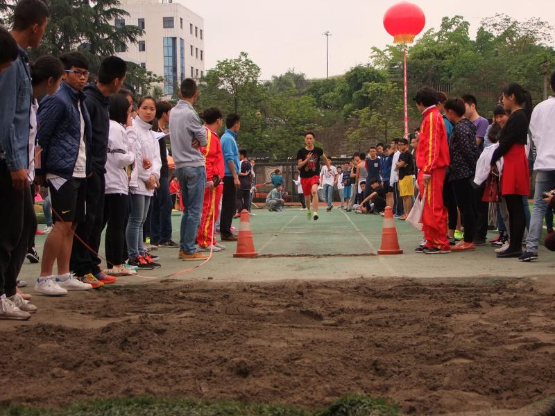 各位选手各就各位,比赛一开始,面对来自各学院的优秀选手,王震同学表现的不慌不忙,他从容向起跑区走去。待裁判员的一声令下后,只见衣着一身黑色运动衣的他,标准助跑、踏条、腾空、落地,一系列的动作完整而又漂亮。在第二跳时他发挥更加稳定,面对激烈的竞争对手他沉着冷静、毫不畏惧、状态也愈加出色。一旁的啦啦队不停地为他叫喊着,“王震加油,文新加油”,在同学们的期望中,王震同学用自己最好的状态最后一搏,拼尽自己的所有,蹬腿、起跳、奋力一跃,一连串的动作赢得了围在沙坑周围同学的热烈掌声。