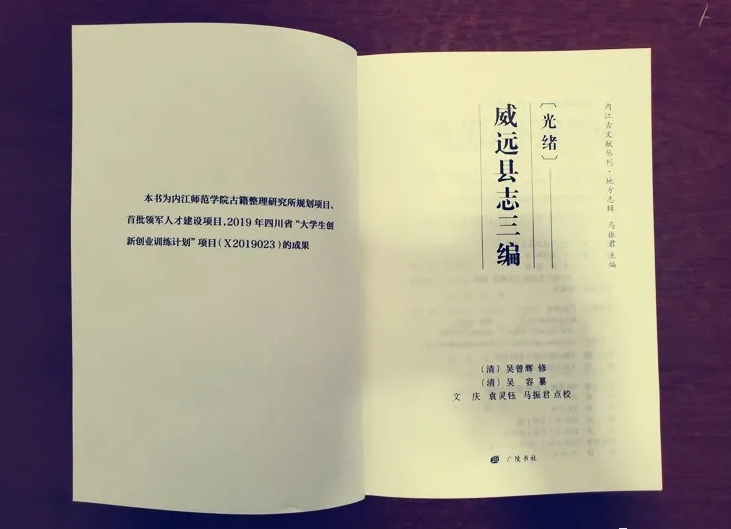 2020年7月,内江古方志《〔光绪〕威远县志三编》由广陵书社出版发行。此志原由吴曾辉(清代)修、吴容(清代)纂,由古籍整理研究所所长马振君和他的学生文庆、袁灵钰点校,是内江师范学院古籍整理研究所规划项目、首批领军人才建设项目、2019年四川省“大学生创新创业训练计划”项目(X2019023)的首部成果。