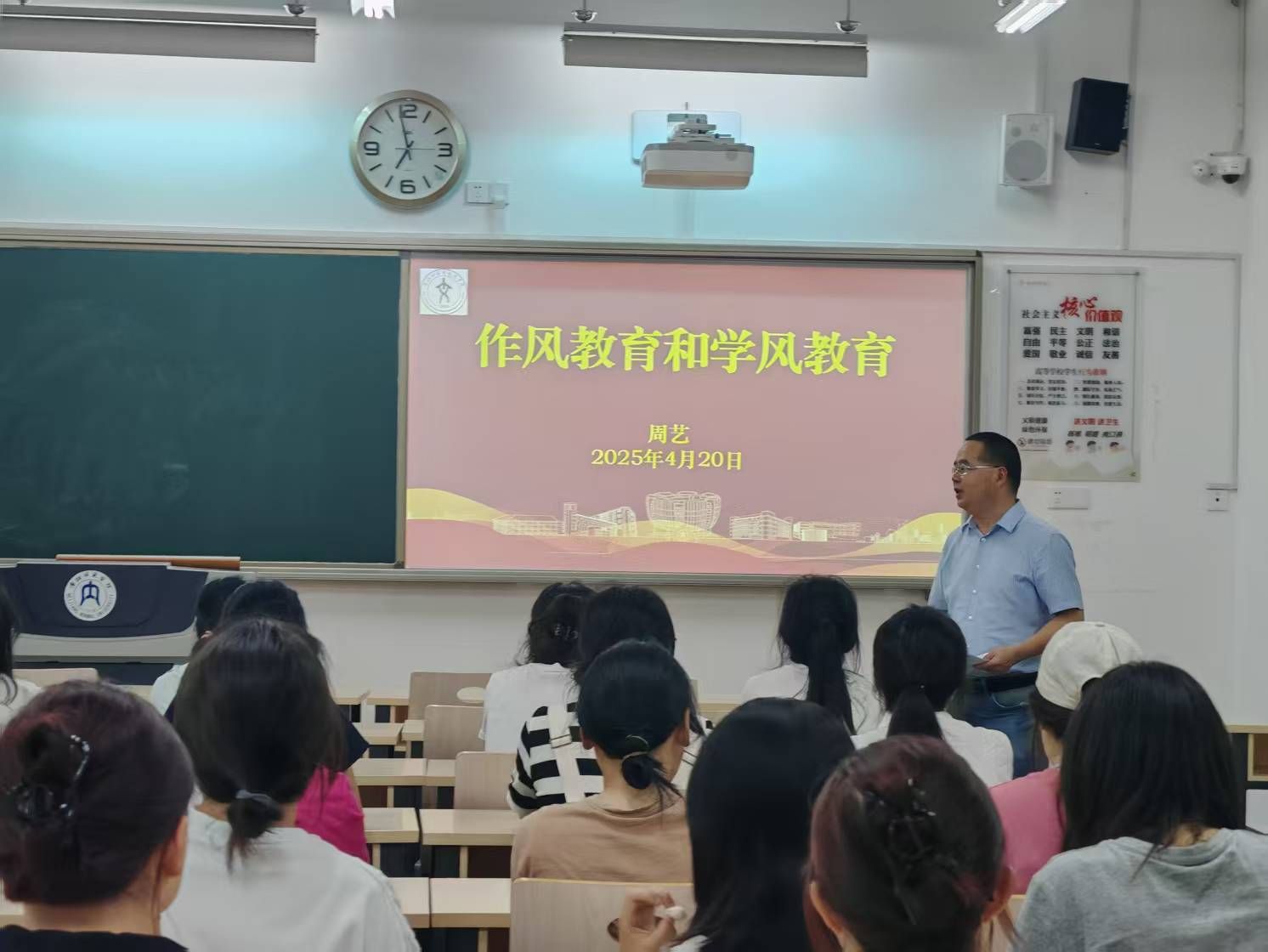 2025年4月20日,文学院党委书记周艺深入联系班级2024级7班数字人文专业,为同学们带来了一场主题为《作风教育与学风教育》的党课,并参加了班级班会活动。此次党课与班会紧密结合,旨在深入贯彻中央八项规定精神,进一步加强学风建设,引导学生树立正确的学习态度和价值观。2024级7班班主任陈康哲及全体同学参加了此次会议。