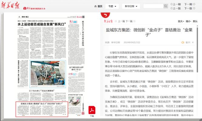 近日,《新华日报》第4版“要闻·观点”栏目,以《盐城东方集团:微创新“金点子”喜结善治“金果子”》为题,聚焦盐城东方集团通过开展“微创新”活动,充分发挥广大干部职工在企业转型发展实践中的积极作用,推进公司高质量发展走在前列。